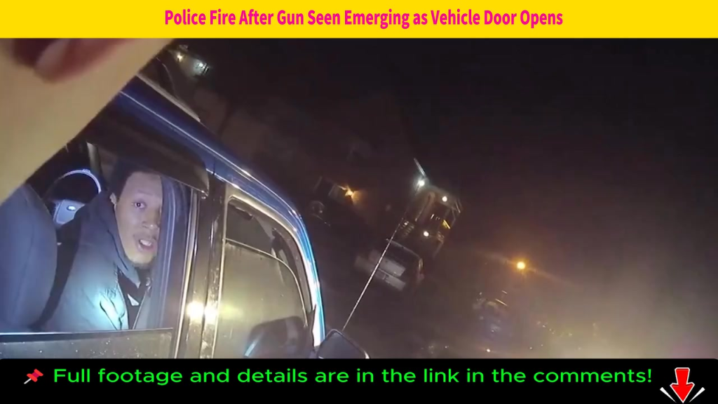 As the door opens, video captures a critical moment. Eubanks suddenly raises one hand and points it toward the officer. While the object in his hand is partially obscured by shadows inside the vehicle, it appears dark and metallic.
