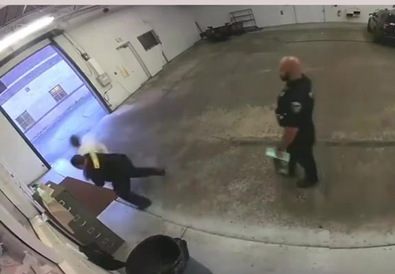 The footage, captured by a surveillance camera, shows an officer forcefully restraining a man inside what appears to be a holding area. Moments later, the man is heard crying out, “You just broke my neck,” as he collapses in visible distress. Another officer in the room appears startled by the outburst, but the detainee’s pleas for medical attention immediately escalated the situation into a serious allegation of assault.