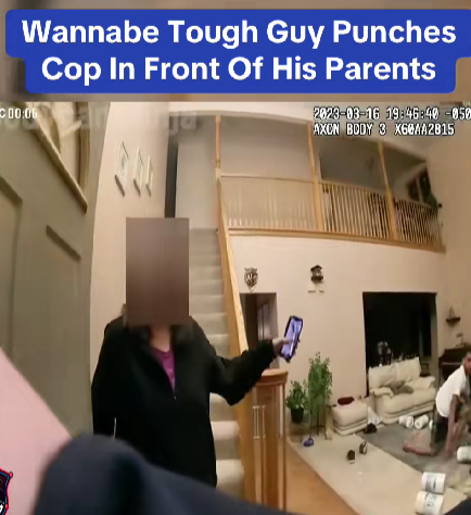 According to the footage, the individual suddenly lashes out toward an officer, throwing a punch right in front of his own parents. The reaction in the room is immediate. Shock, confusion, and disbelief ripple through the space as the situation escalates from a verbal confrontation into a physical one.