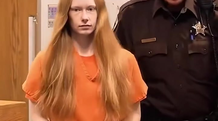 The footage shows the suspect with long blond hair, standing silently near the witness stand as Judge Mark Schroeder presides over the hearing. On the wall behind him, printed charts and documents outline key pieces of evidence — including data prosecutors say supports their case. The tension in the courtroom is unmistakable. No one moves. No one speaks. All eyes remain fixed on the young woman accused of a dangerous and potentially life-altering offense.