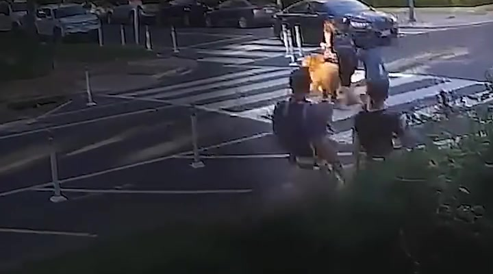 The video shows a calm afternoon with families and pedestrians moving through the intersection. Suddenly, an SUV approaches at noticeable speed. In a split second, it enters the crosswalk where a family, including small children, is already halfway across. Before anyone can react, the vehicle makes contact and chaos unfolds. The impact sends shockwaves through everyone present as witnesses rush forward to help.