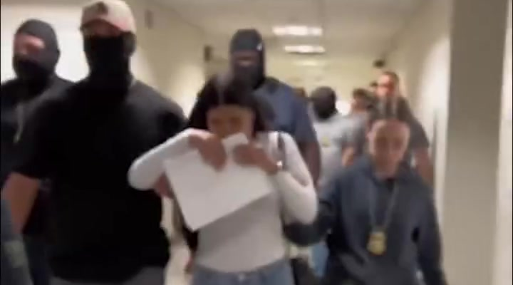 The footage captures the silent but powerful moment as she clutches the documents tightly, shielding herself from cameras and onlookers. Flanked by two officers dressed in dark clothing and masks, the woman’s body language conveys fear, shame, and uncertainty as she is led away. The video’s caption reads: “Covers Her Face With Court Papers as She’s Escorted Away.”
