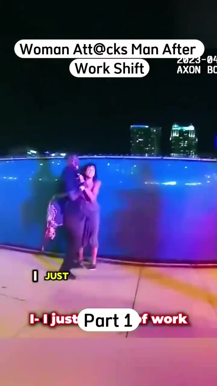 The video opens at night in a well-lit public area, with city lights glowing in the background. A man, believed to have just finished his work shift, is seen walking when a woman suddenly approaches him. At first, the interaction appears verbal — tense, emotional, and clearly unresolved. Within seconds, however, the situation escalates.