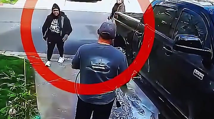 The scene appears calm, almost routine. The driver’s door of the pickup truck is open, and shattered glass is visible on the ground, hinting that something may have already gone wrong moments earlier. A hooded individual walks closer, hands visible, posture relaxed—but not everyone agrees on what that body language really meant. Some viewers say it looked harmless. Others believe it was the calm before chaos.