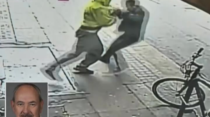 The camera shows a passerby walking calmly down the sidewalk unaware that his life is about to change. A stranger steps into frame wearing a bright yellow jacket that stands out against the gray pavement.