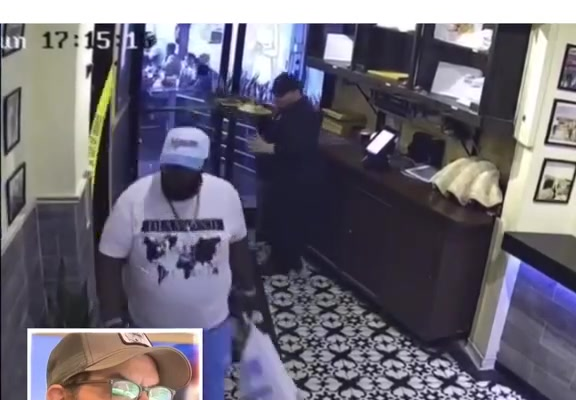 In the dramatic video, the server is seen walking through the dining area with a tray stacked high with plates, drinks, and fresh meals for waiting customers. The restaurant appears busy but orderly — until a man enters through the front door holding a plastic bag and looking towards the server’s path.