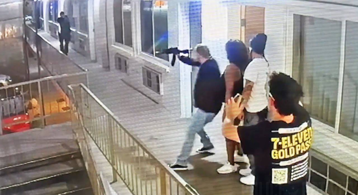 The officer moved to find cover, and the man with the rifle appeared on the second-floor walkway, stating that two people had been shot and needed help.