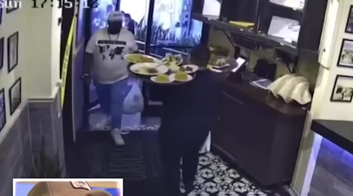 In the dramatic video, the server is seen walking through the dining area with a tray stacked high with plates, drinks, and fresh meals for waiting customers. The restaurant appears busy but orderly — until a man enters through the front door holding a plastic bag and looking towards the server’s path.