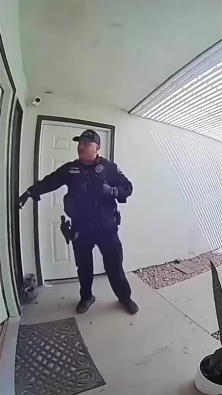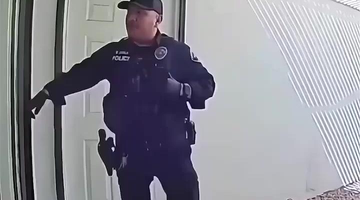 According to commentary surrounding the footage, officers were responding to a call at a residential address. The setting appears calm at first: a quiet entryway, daylight, no visible crowd, no obvious signs of violence. But moments like this are exactly why law enforcement treats every call as unpredictable.