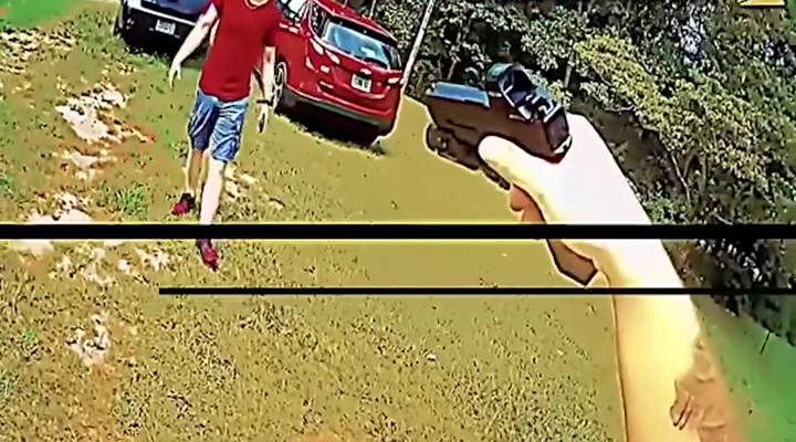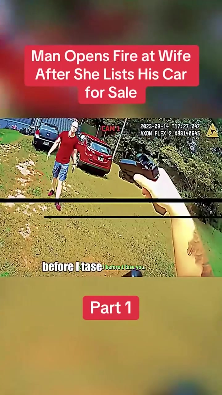 Bodycam footage from responding officers shows the husband, wearing a red shirt and shorts, storming into the yard armed with a handgun. Officers ordered him to drop the weapon, but instead, he fired a shot in his wife’s direction. She ducked behind a parked car and screamed for help as chaos erupted.