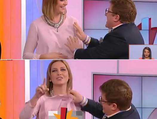 This TV presenter just shrugged off a colleague’s arm on her back…so he shockingly FLASHES her bra on live telly