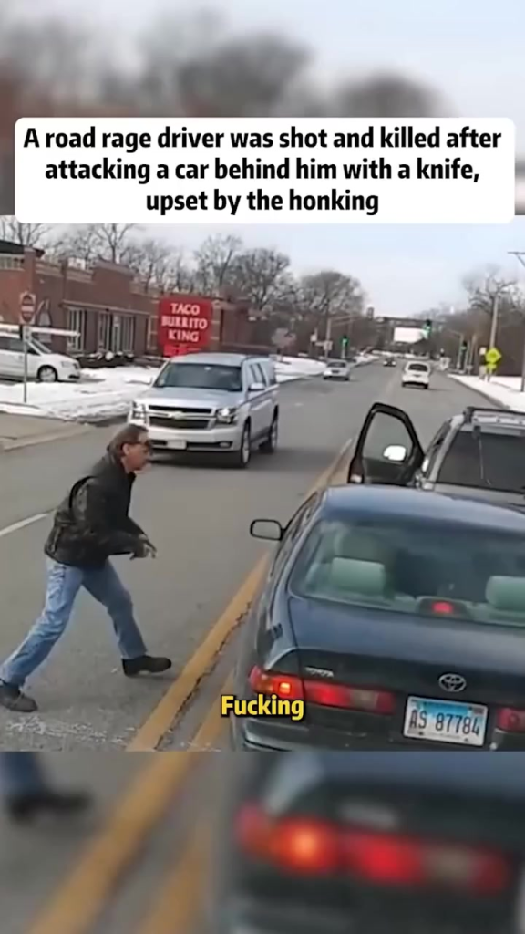 A disturbing road-rage incident captured on camera has gone viral after a driver, enraged by honking behind him, escalated the situation into a dangerous confrontation. The footage shows the man approaching another vehicle with what appears to be a knife, leading to a tragic encounter that ended with him being fatally shot. Due to the extremely sensitive nature of the event, all violent details are softened, censored, and written in Facebook-safe language.