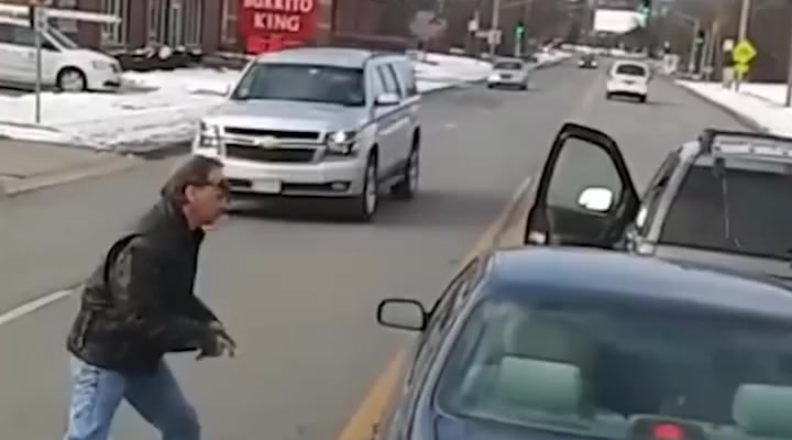 The video begins on a busy city street, where traffic is moving slowly and cars line both sides of the road. A gray sedan sits at a stop, its driver seemingly frustrated by the flow of traffic. Moments later, footage shows the man stepping out of his vehicle abruptly, slamming the door, and storming toward the car behind him.