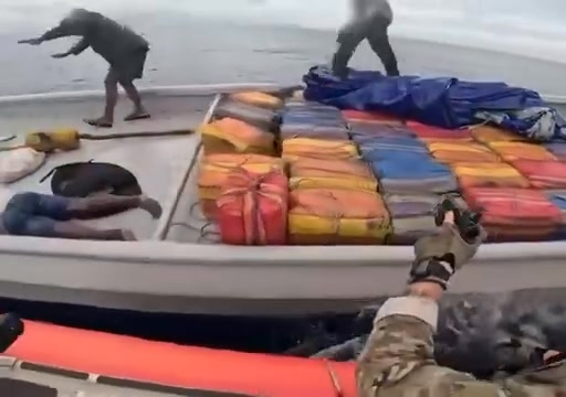 “Hands up!” the service members can be heard yelling in Spanish at the suspects on the alleged smuggling vessel.