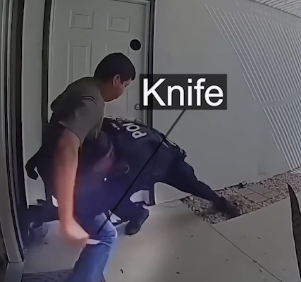 A chilling body-cam moment is making the rounds online after footage surfaced showing a routine doorstep encounter erupt into a sudden, life-threatening struggle. The single word flashing on screen — “Knife” — says everything about how fast the situation spiraled.