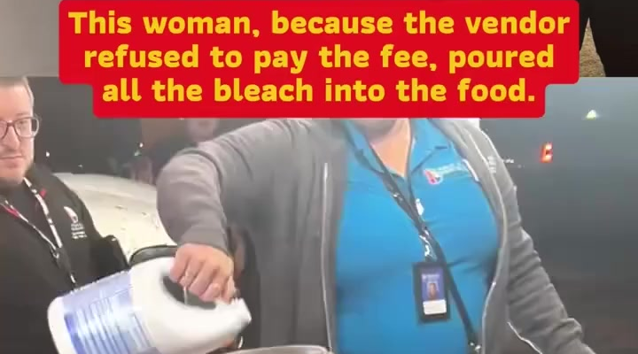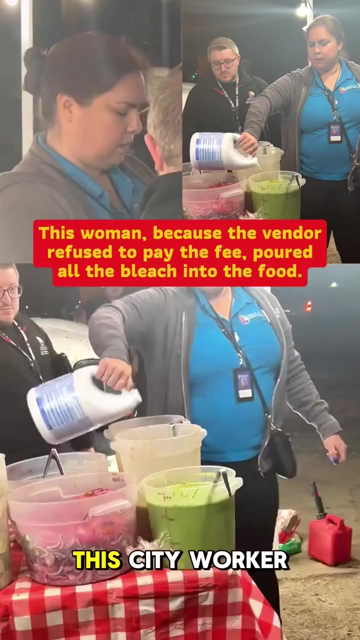 In the footage, the city worker can be seen holding a large container labeled as cleaning bleach. Moments later, she begins pouring the liquid into the vendor’s food containers while other staff look on. People nearby can be heard reacting with surprise, confusion, and frustration. The vendor, visibly upset, attempts to protest the destruction of the food, which had been prepared and stored for customers.