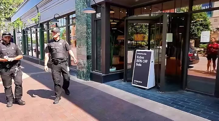 The footage shows the officers exchanging a look before one of them steps forward with determination. Without hesitation, he announces, “You’re being arrested.” His tone wasn’t loud, but it carried an unmistakable authority that caught the attention of everyone nearby. Shoppers stopped mid-step, confused and curious about what could have prompted such a sudden escalation.